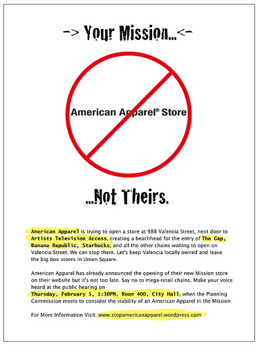 Most of the debate over American Apparel has taken place on the blogosphere, with a sort of dialogue between Mission Mission, SFist and Elliot’s blog, Stop American Apparel. Mission Mission prompted American Apparel to issue an open letter called, “Note From a Potential Neighbor.”