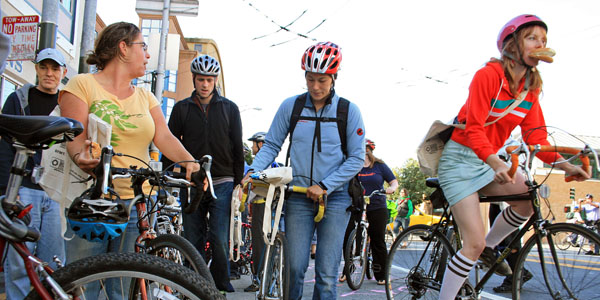 People poured down Mission District bike lanes this morning for the annual Bike to Work Day hosted by the San Francisco Bicycle Coalition. The Mission’s two morning energizer stations fed people bagels and coffee at the corner of 17th and Valencia Streets as well at Caesar Chavez and Harrision Streets.