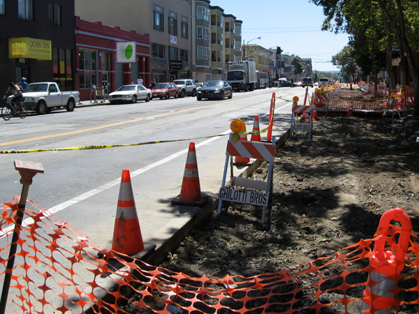 I actually think they should leave the torn up sidewalks in their current state. It perfectly reflects and aesthetically represents the “San Francisco Values” of our city’s planners and decision-makers: total hostility towards cyclists and pedestrians, and the priority given to lazy, entitled drivers to drive every damn place, no matter how crowded, righteously honking bikes and peds out of the way, and tacitly threatening to run them over with a push on the gas. Cities are for cars, not people or art, duh. I think they should complete the deal, and just close it to all but cars. Share the road, get out of their way.