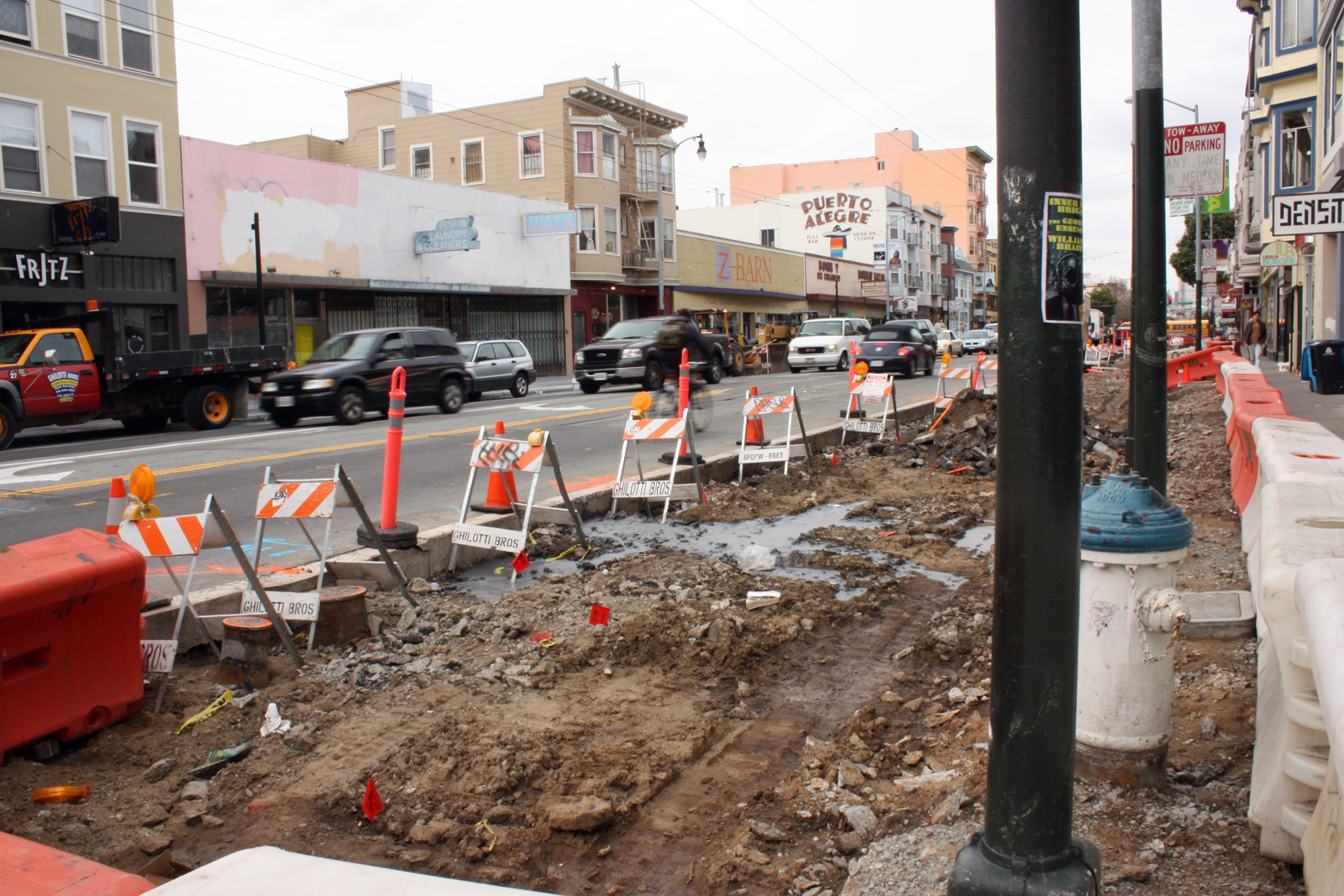 and here it is June, and this project still isn’t done. Since this article was written, they’ve hit a gas line and shut down the businesses between 17th and 18th for three hours. The corner of 18th and Valencia has been a mess for two months.