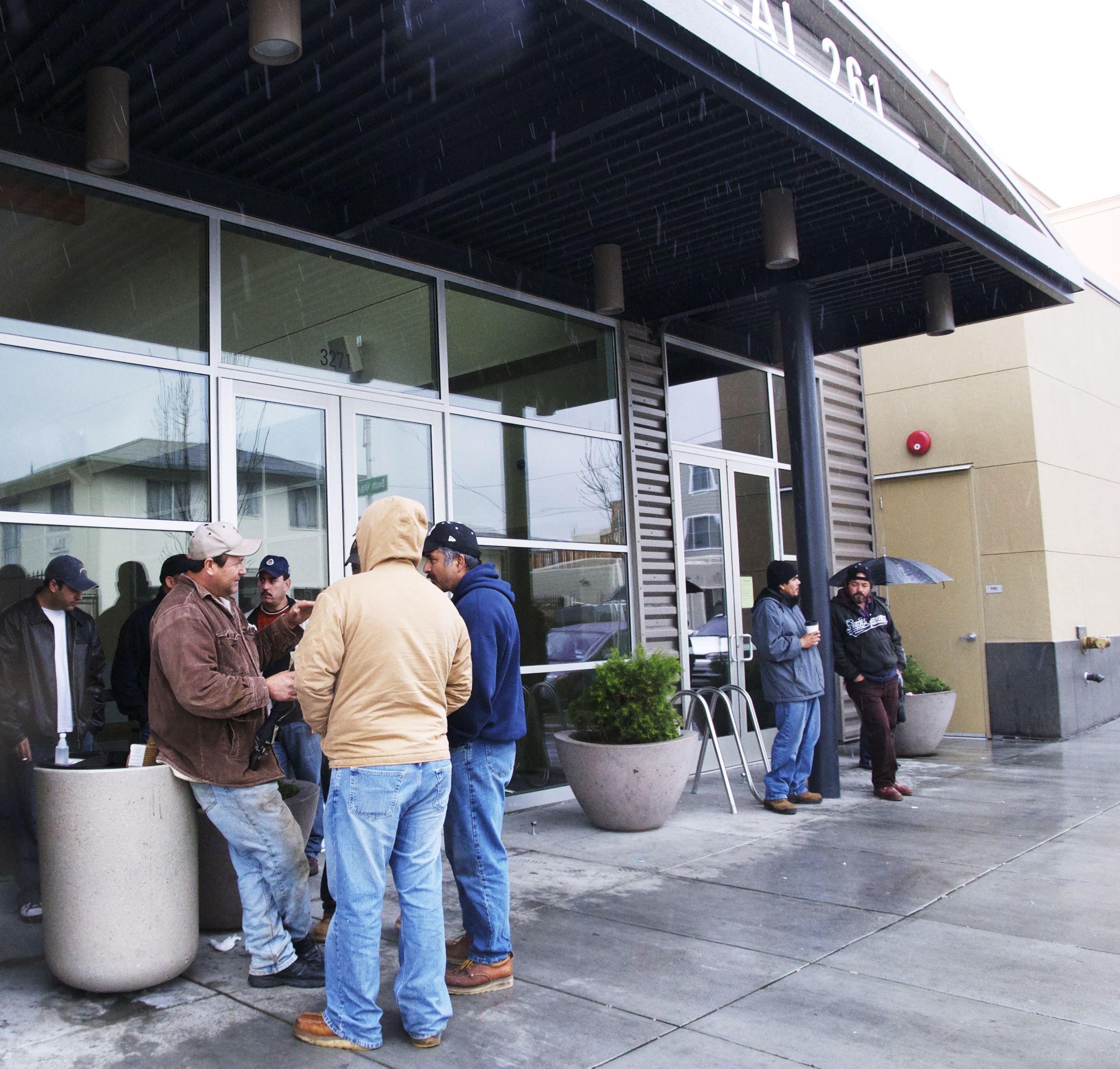 Although the pelting rain made construction jobs unlikely, about two dozen union members came to Local 261 at the corner of Shotwell and 18th one morning earlier this month to wait for their names to be called.