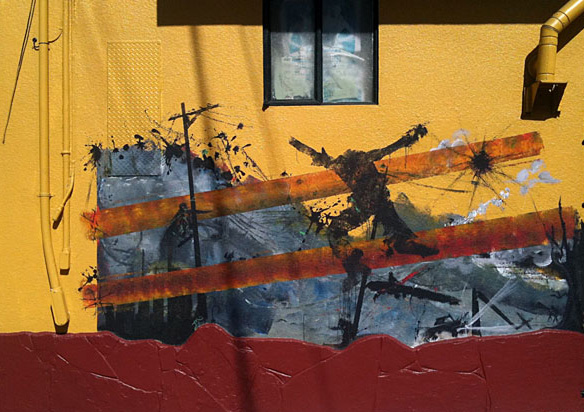 Anonymous mural (photo) next to Dagwood & Scoops at 24th is new (to me). A different kind of mural for a different kind of time. Also saw Zore and friends, “a collective of individuals” putting up a work on 24th and Capp with “Aztec, Japanese, and Graffiti” influences.