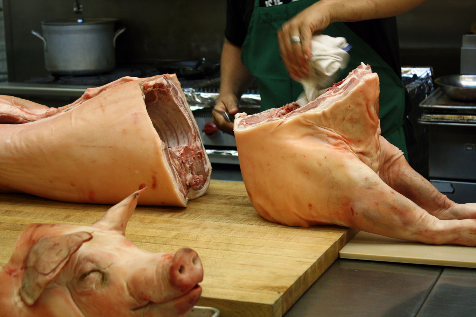 The pig has dainty pink toenails, enormous veined and crinkled ears, and a sweet expression. A woman is struggling to cut off its head with a hacksaw. “It’s about cutting through,” says Ryan Farr. “Follow the line of the ribs.” He takes the hacksaw out of her hand for a moment and adjusts it. A student pulls an iPhone out from underneath his green apron and takes a picture.