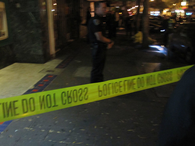 The homicide team was still investigating the incident at 9:30 p.m. The body, covered with a yellow tarp, lay nearby.