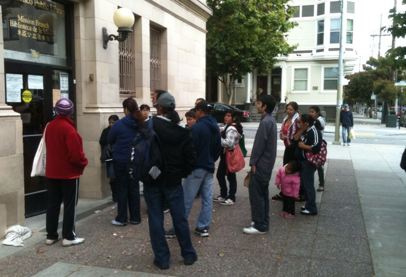 That’s why every Tuesday morning a gaggle of Mission families waits sleepily outside the library for the doors to open.