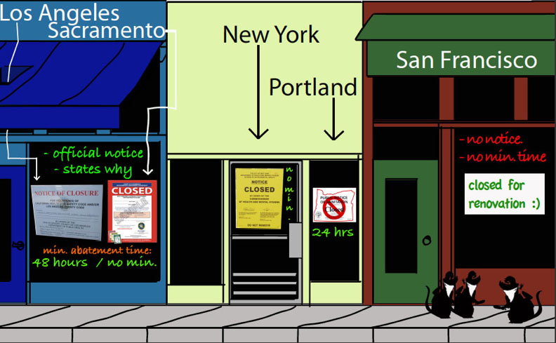 Those cities require that a formal notice be posted outside the restaurant when it is closed for health violations. In Los Angeles and Sacramento, the notice also states the reason for the closure.