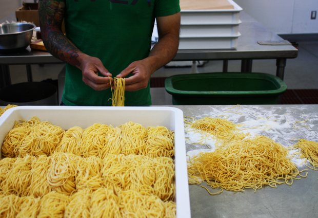 Nakano, uno de los arrendatarios del espacio a precio del mercado, renunció a un trabajo como ayudante de Chef en Nopa para comenzar un negocio de un carrito de fideo ramen. Las cosas están un poco tensas –ha comenzado a subcontratar la producción de fideo y hace unos días tuvo que regresar 200 libras de ellos porque estaban mal cortados. Todavía no están perfectos.