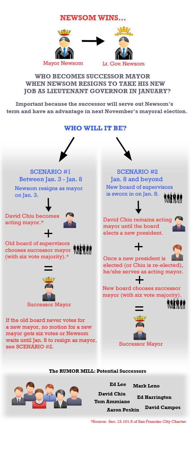 Hay mucha especulación sobre quién será elegido sucesor de Newsom durante el próximo mes de enero. La última vez que San Francisco se enfrentó a esta misma situación fue en 1978, cuando el alcalde George Moscone fue asesinado y Dianne Feinstein (presidenta de la Junta de Supervisores en ese entonces) sirvió durante el último periodo. Si hubiera algún desacuerdo en tato a las reglas, se acudiría a la oficina del consejero legal de la ciudad para obtener orientación en el tema.