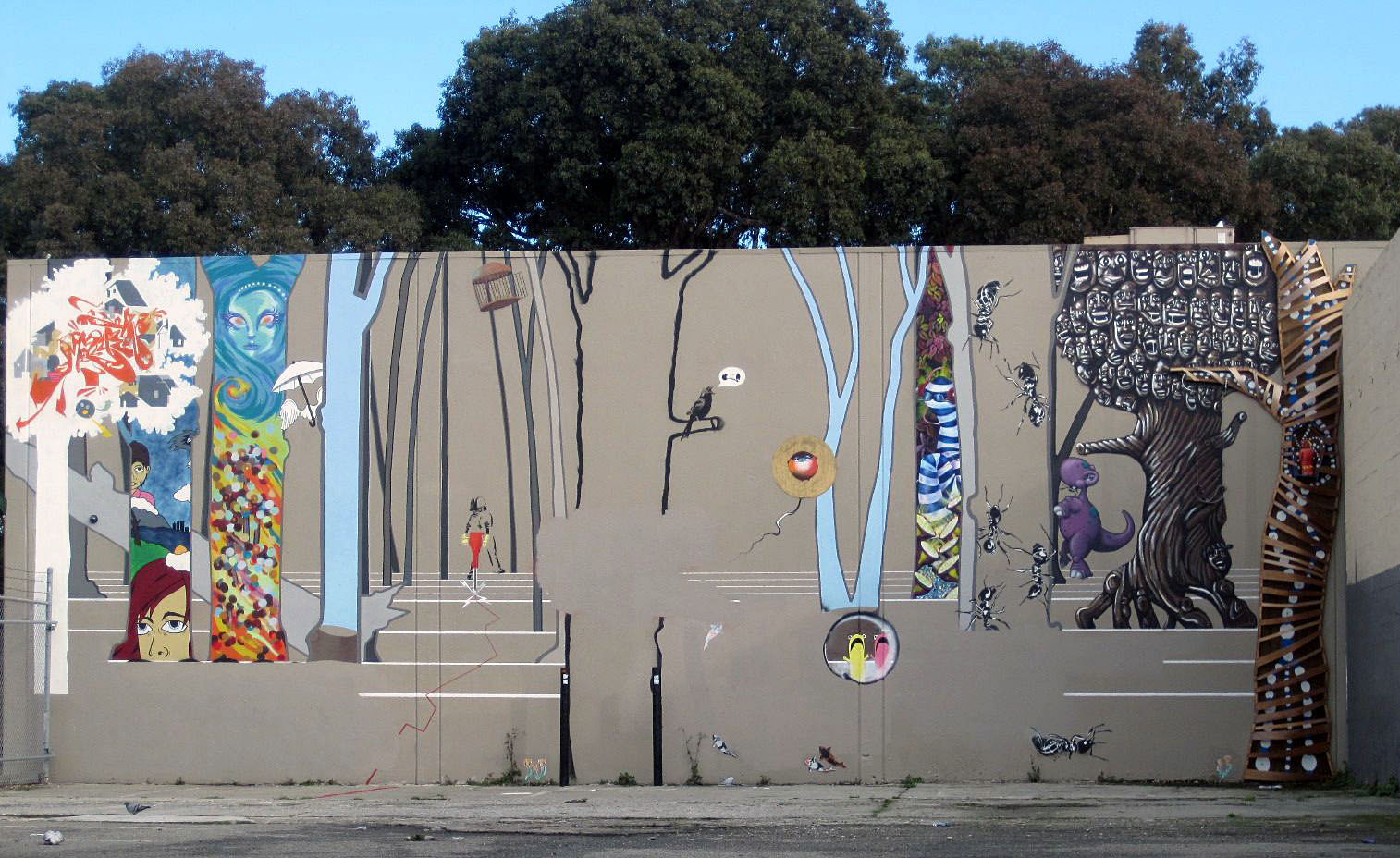 None of the crap on either side of the Banksy should have ever happened. Standing by itself, the Banksy made perfect sense, because he worked the trees on the far side of the building into the tongue-in-cheek line drawing. Left alone, it was masterful. Less is more escaped the local wannabes.