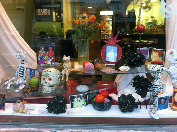 En los escaparates de la calle Valencia, los altares del Día de Muertos celebran a los seres amados que ya no están en la tierra. Y dentro de la galería Encantada, su propietaria Mía González, con un peinado estilo Frida Kahlo, se sienta detrás del mostrador lista para ayudarle a los clientes a encontrar los ingredientes para hacer los altares y calaveras.