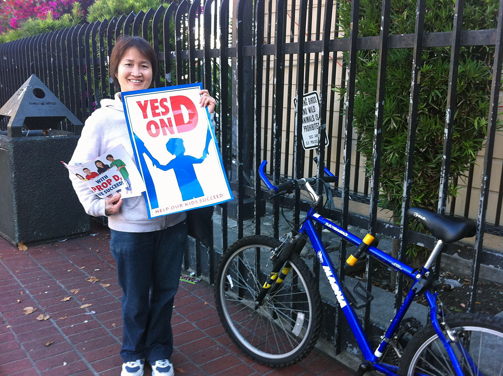 She placed her campaign signs near pro-Prop. D signs and attended house parties in favor of the proposition. On October 27, she posted photos of one such house party to an album on her campaign’s Facebook page; in them she’s seen posing with school board member Norman Yee and newly elected member Emily Murase.