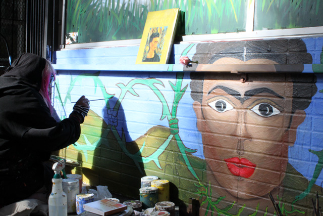 Laura Campos is finishing a commissioned mural outside of Casa del Canario. She said this image is perfect for the new bird store on 24th Street because Frida Kahlo liked being surrounded by birds.