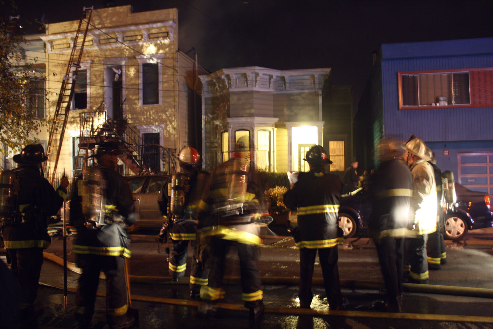 In fact, all eight residents of 1040 Florida appear to be safe and sound. The two cats haven’t shown up yet, but all the doors were left open, and they’re presumed fine. It’s a beautiful night and the sidewalk is crowded — kids are hoisted on to shoulders to get a better view, the front stoop of every house is filled with people sitting out like spectators at a slow-moving parade.