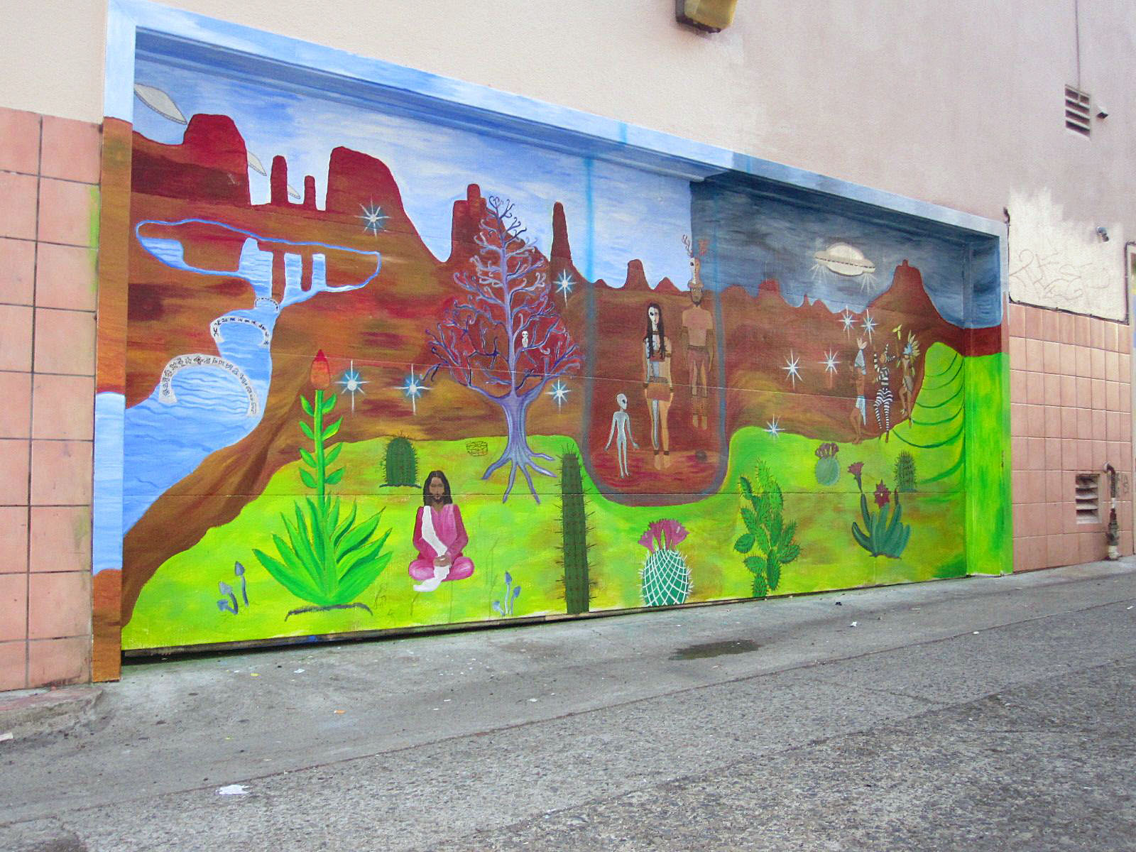 It’s by Laura Campos, the same artist working on the storefront Frida mural nearby on 24th. Last week, Campos told me this mural is unfinished, and she’s eager to complete the Frida commission to get back to her beloved aliens!