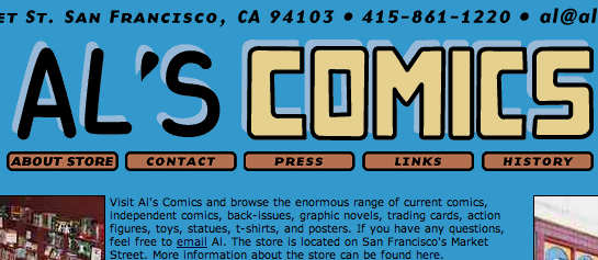 Al’s has long been a community favorite and was named one of San Francisco’s best comic book stores by KCBS in December 2010 (http://sanfrancisco.cbslocal.com/top-lists/san-francisco%E2%80%99s-5-best-comic-book-stores/). According to KCBS, “the real draw at Al’s Comics is Al himself. If you were to call Central Casting and ask for a curmudgeonly comic book store guy, you’d get owner Al Kizziah. No drinks! No food! No touching! No kidding! But it all adds to the nostalgic experience of the comic shop. Al has been at the helm of his beloved store, knowing more about comics than you (and saying so) for over twenty years.”