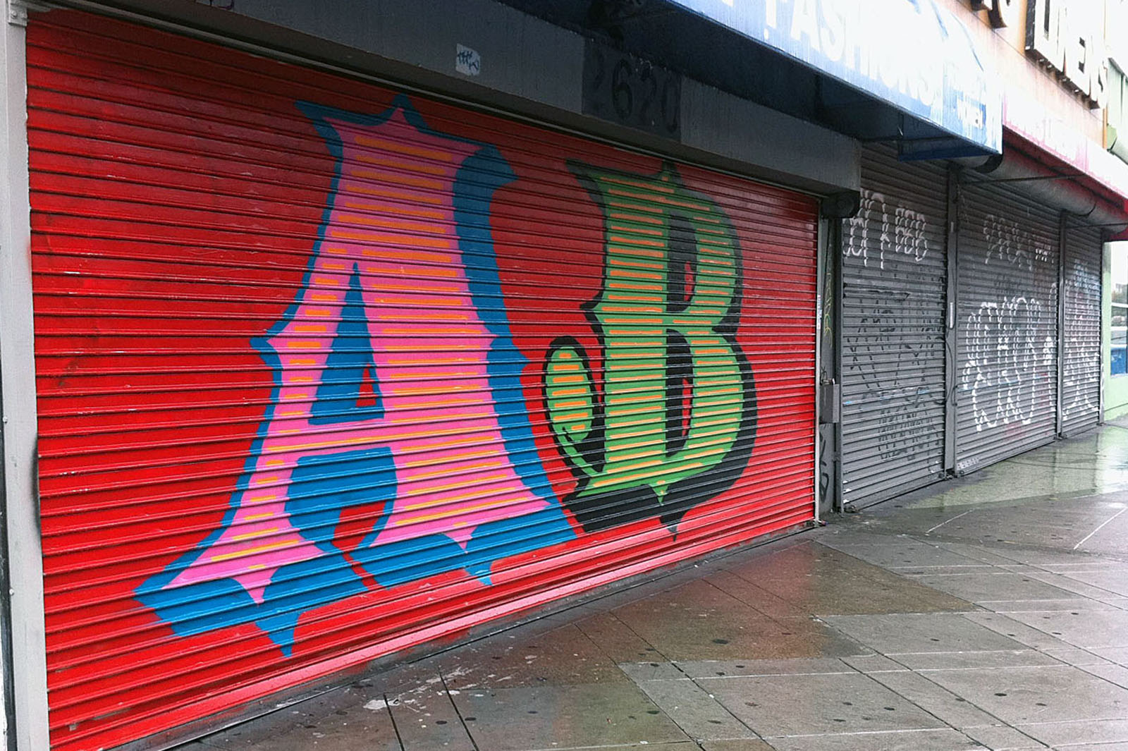 Curbs and Stoops writes, “Last summer EINE painted 26 shop shutter on London’s Middlesex Street with every letter from A-Z, revitalizing a dreary stretch of road with a technicolor alphabet. Now the artist is treating the city of San Francisco to their very own personalized alphabet, painting walls and shutters with letters around the city. ”