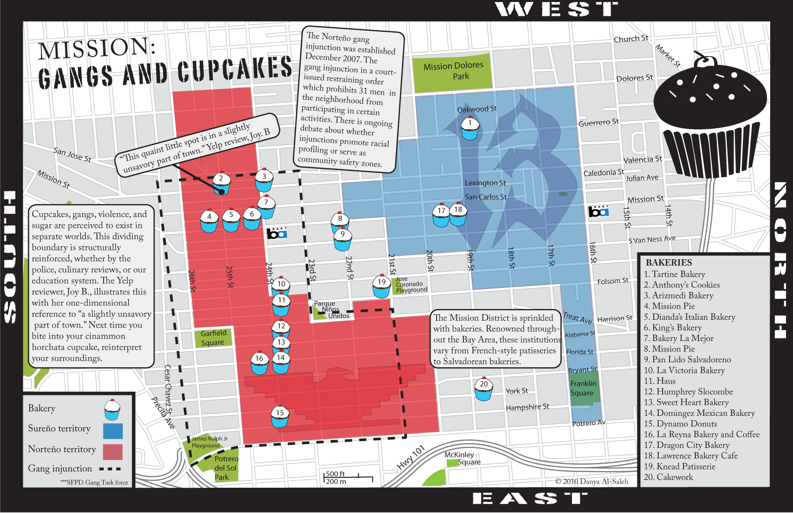 Mission residents *do not* ignore the violence because they can’t. They can’t ignore the sirens coming down from the police cars on 17th street. If this map was made by someone who actually LIVED in the mission, it would be quite different. Danya Al-Saleh should stick to the ivory tower in Berkeley and make a map of that.