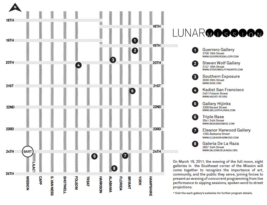 Tonight, tonight in the big moon’s light, eight galleries in the southeast corner of the Mission open their doors for an evening of art and performance. Click here for a PDF map — though please note that this map, provided by the event organizers, has an error. Two map points are mislabeled: #7 should be labeled #8, and vice versa. The event runs 7 to 10 p.m. Here’s our roundup of what to expect:
