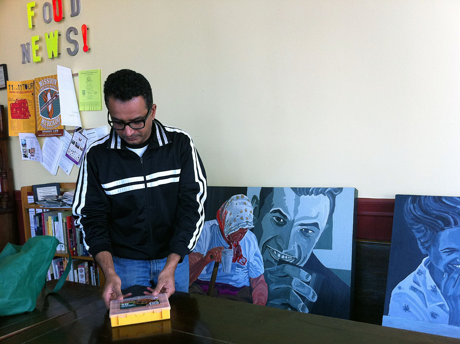 Like any Indian in the Mission, I’m a techie, says Gaurav Narasimhan as he hangs his paintings on Friday morning at Mission Pie.