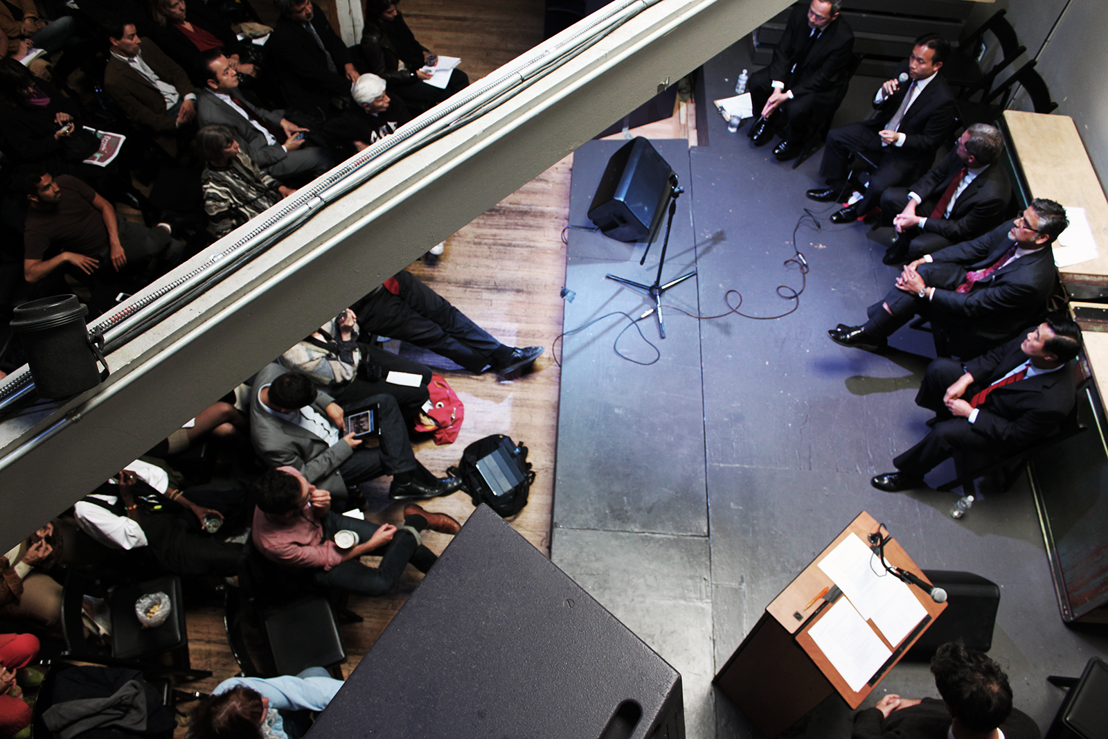The debate, sponsored by the Mission Merchants Association, Valencia Corridor Merchants Association, Greater Mission Rotary, San Francisco Hispanic Chamber of Commerce and San Francisco La Raza Lawyers Association, was held at Public Works. The bar was open and there were snacks (chips, salsa and pulled pork on one side of the room, a hummus platter and bruschetta on the other). The crowd was clean-cut and well-behaved. Many of them seemed to work at City Hall.