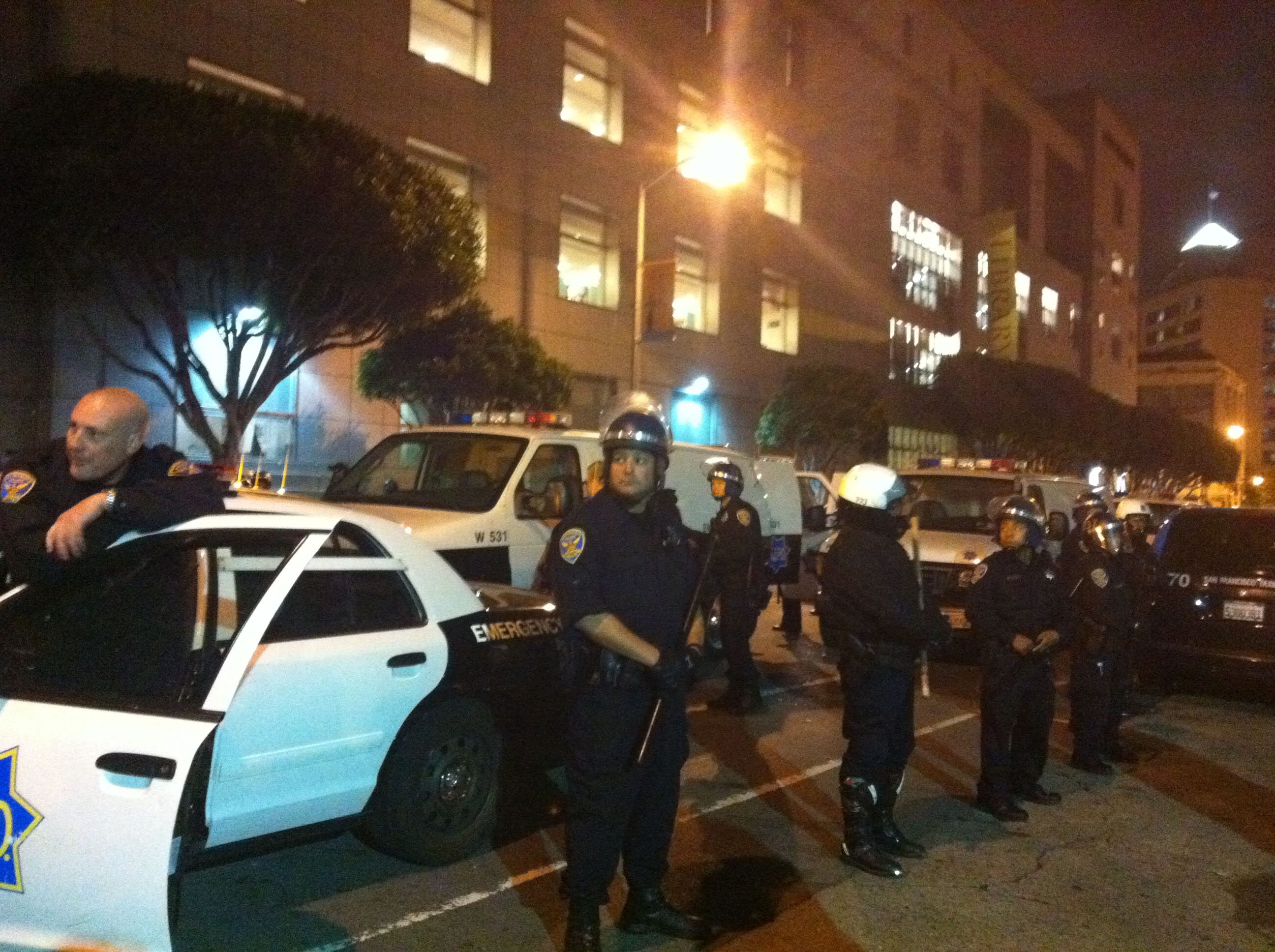 Small group of protesters at Civic Center BART platform. Huge crowd of photographers and other media people. Lots of cops in riot gear. Pics of platform and some on Market St. http://opbart.4ormat.com/
