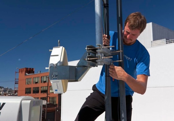 Igual de increíble es el hecho de que todas las cosas en nuestra azotea (el láser vinculado a la fibra, un respaldo amplio de banda ancha de radio, APC y cuatro enlaces a otros puntos de acceso en el sur de la comunidad de la Misión) usan en conjunto menos electricidad que un foco de luz de 150 Watts. El ahorro de energía proviene de dispositivos muy sensibles de baja potencia. Cada uno debe tener una vista limpia de su contraparte. Dicho requisito permite que la señal sea suave, ya que el lóbulo no puede penetrar funcionalmente los muros, azoteas o vegetación. La antena codifica la señal, la que a su vez vuelve a codificarse cuando el router de cada unidad distribuye la fuente.