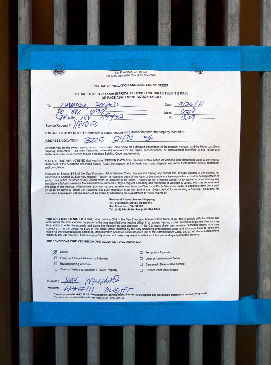 It’s a clear violation of Section 80.5 of San Francisco’s Administrative Code, and Navarda, Donald has only 15 days to repair and/or improve or face abatement. Wow. How will Navarda, Donald ever get the word in time, since he lives way up in Sparks, Nevada?