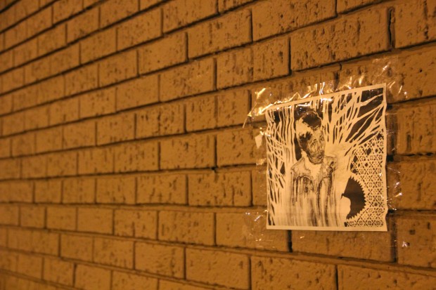 La pintura chorreaba desde la parte de arriba del primer piso, 67 filas de ladrillo de altura, chorreando por encima de uno de los murales más queridos de la Misión —un retrato pegado con engrudo hace tres años estilo encaje que conmemora a Silvia Elena, una adolescente víctima de los feminicidios en Juárez, México.