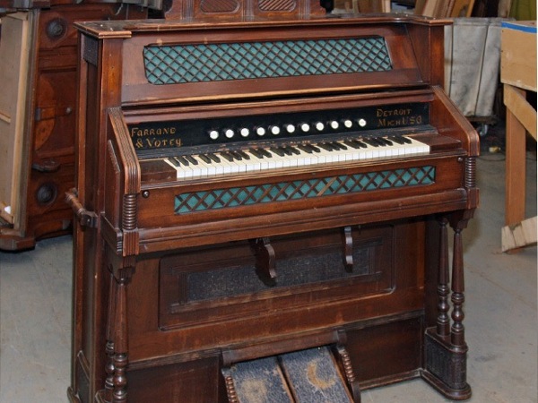 Así que, por $125 dólares y un camión prestado más tarde, Alma —como ahora llamo al órgano de lengüetilla Farrand & Votey (ref 1, ref 2)— tuvo un nuevo hogar. Cuando puse mi pie en los pedales, Alma exhaló nubes de esporas de hongos. Había varias teclas que no tenían sonido y la mitad de los registros eran inoperables. Alma sería un reto, una reconstrucción. Le quité la parte trasera para dejar al descubierto una matriz de palancas, fuelles y resortes y me di cuenta que la restauración de Alma estaba más allá de mí. Me fui de regreso a la computadora, y puse “órgano de lengüetillas” en Google.