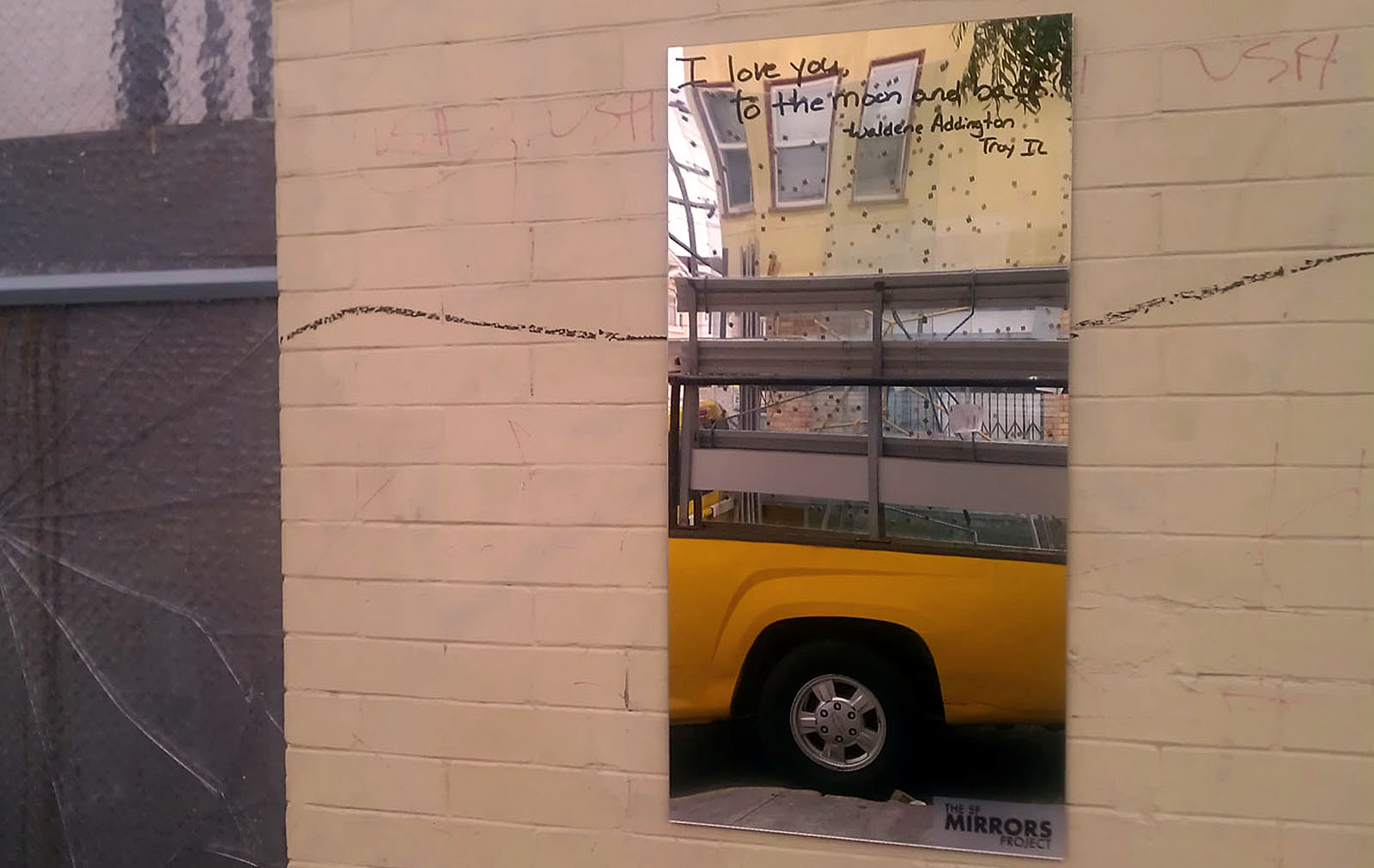 The full-time student and freelance computer graphics artist raised more than $3,000 last spring through a Kickstarter campaign, and asked donors to send one-sentence messages to be written on the mirrors. Donors’ names would follow their message, if they wanted it.