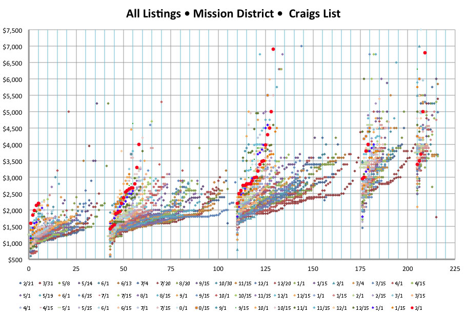 Craigslist seems to be telling us that more apartments are available in the Mission. Here are some charts that show the trends as represented by listings on Craigslist. It’s important to remember that these plots reflect the situation on the first and 15th of each month. All kinds of crazy things happen between “snapshot” times. I have omitted single rooms and duplicate listings. The charts provide a sense of the trends.