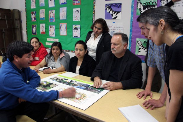 Después de haberle pedido a otros que se abstuvieran de comentar hasta el final de la presentación, los funcionarios municipales delimitaron a detalle el diseño propuesto. Dicho diseño incluye lotes para jardines comunitarios, un anfiteatro al aire libre, máquinas de ejercicio y una cisterna subterránea. Fue entonces que la sala se dividió en tres grupos para debatir cómo se podría mejorar el plan.