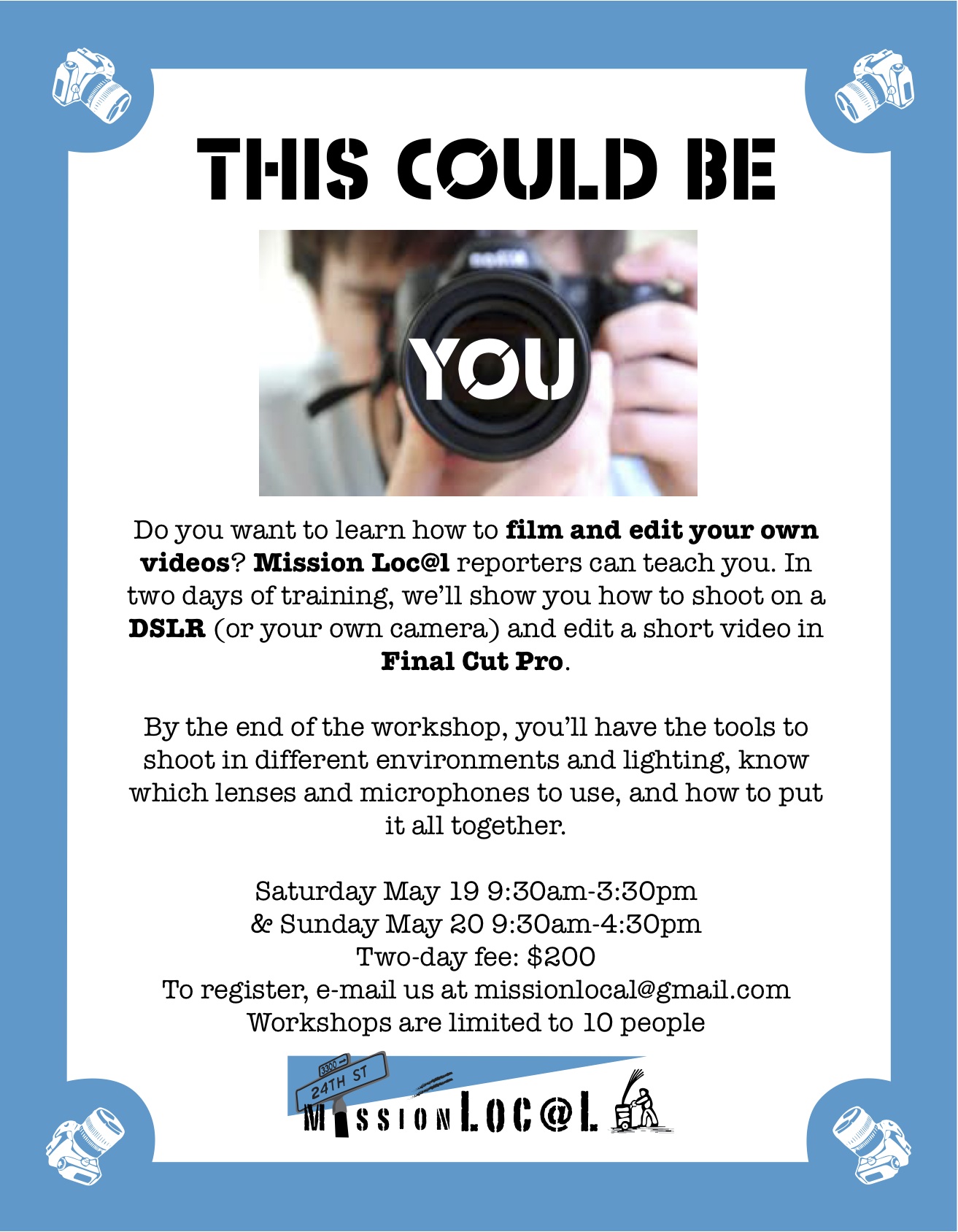 The weekend workshop will cover the basics of shooting video and video editing. We’ll explain how to use camera gear, how to set up and conduct video interviews, and send you out in the Mission to shoot. Then we’ll teach you how to put it all together in a short video.