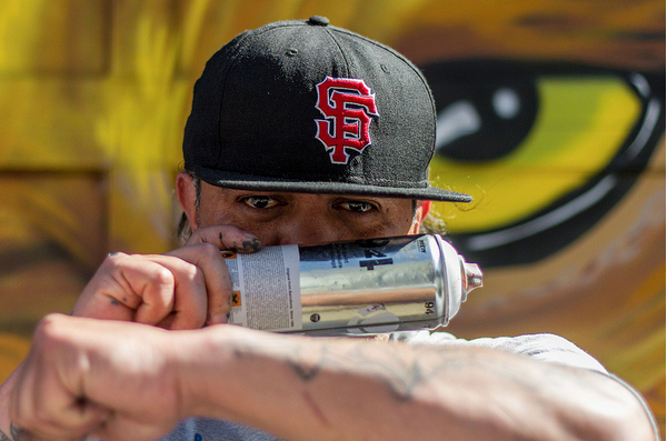 The day after the photowalk, I found myself wandering the Mission again and stumbled across a hive of activity in Clarion Alley. The day before, probably hundreds of photos were taken of the murals; now, a day later, many were already gone, painted over by groups of artists. Near the alley’s center, one piece grabbed my attention — a huge cat’s face that was being painstakingly rendered by one individual. I walked over for a chat.