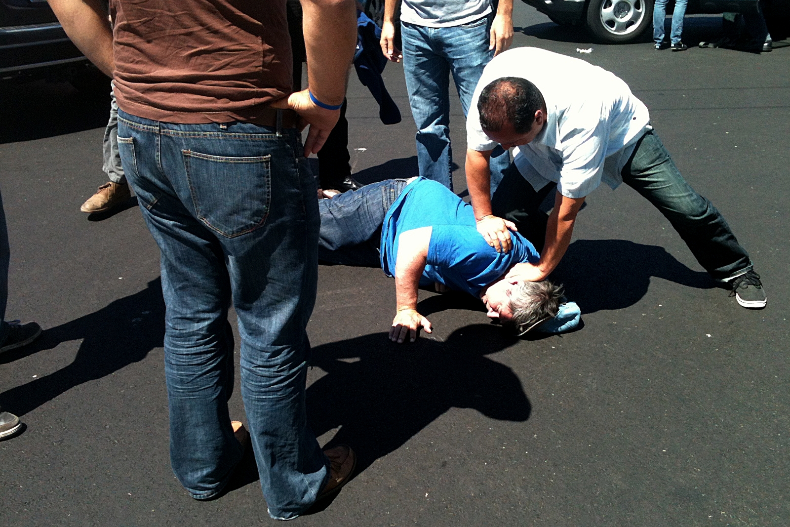 People came from everywhere, and four or five men and one woman pulled him away from the small car. They were very controlled. They lay him on the ground, and restrained him.