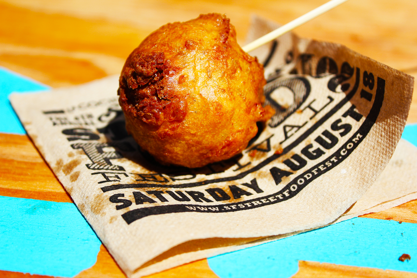 Fried chicken sriracha butter from the Slanted Door. “I’m from the South, so it’s like I know my fried chicken because I’ve tried a lot. Personally, I wish these were a bit spicier, but this is well done. In the South, the fried chicken is breaded heavily and so when you take a bite the breaded layers are evident, but this fried chicken is not breaded that much. It’s really good.” — Richard, Street Food Festival patron