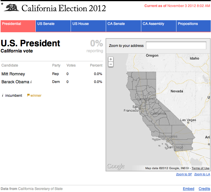 Once the polls close, this interactive California graphic will update with real-time election results as Golden State votes are counted. Watch the results roll in beginning at 8 p.m. PST. Find out how Californians cast their votes for president, U.S. Senate, Congress, the state assembly, the state senate and all of the state propositions.