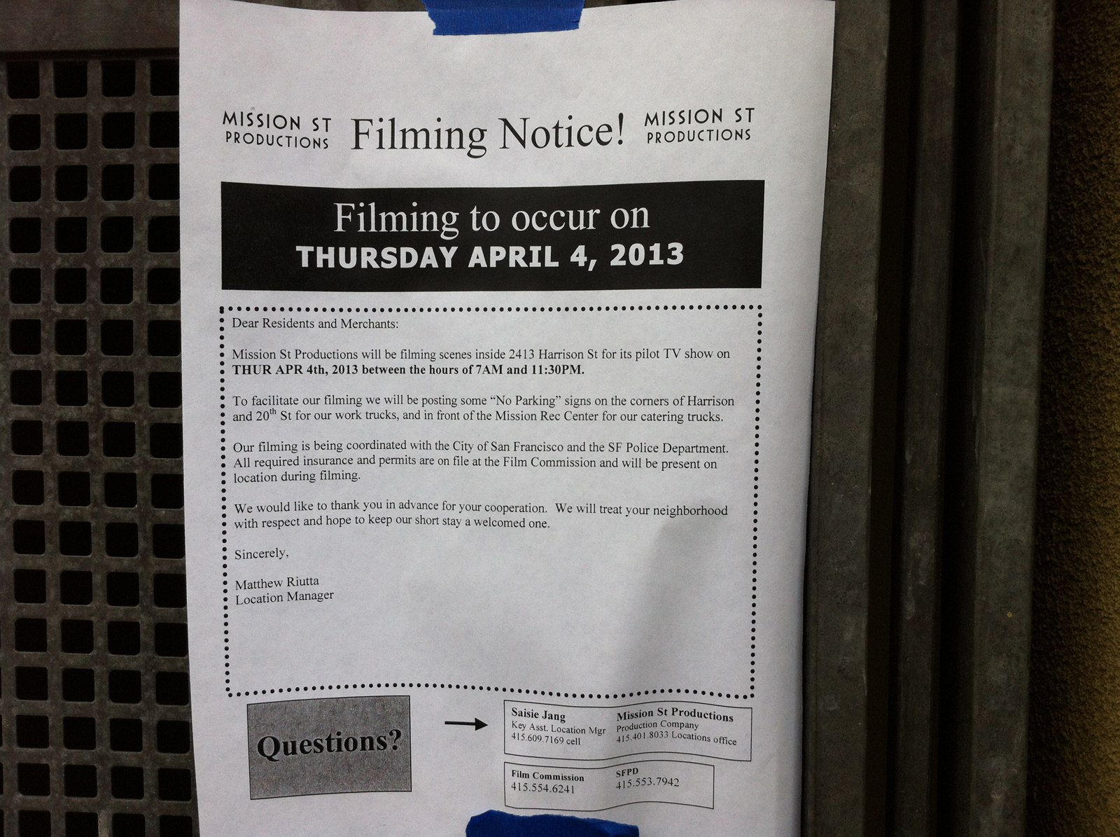 A film crew was at work on Harrison and 20th streets in the Mission today, creating an HBO TV pilot. The show, a comedy, centers on three gay men living in the present-day Mission. As might be expected, one works in the restaurant industry, one is a techie and one an artist. The show does not yet have a name, but producer Kat Landsberg identified it as “The Untitled Michael Lannan Pilot,” named after the writer.