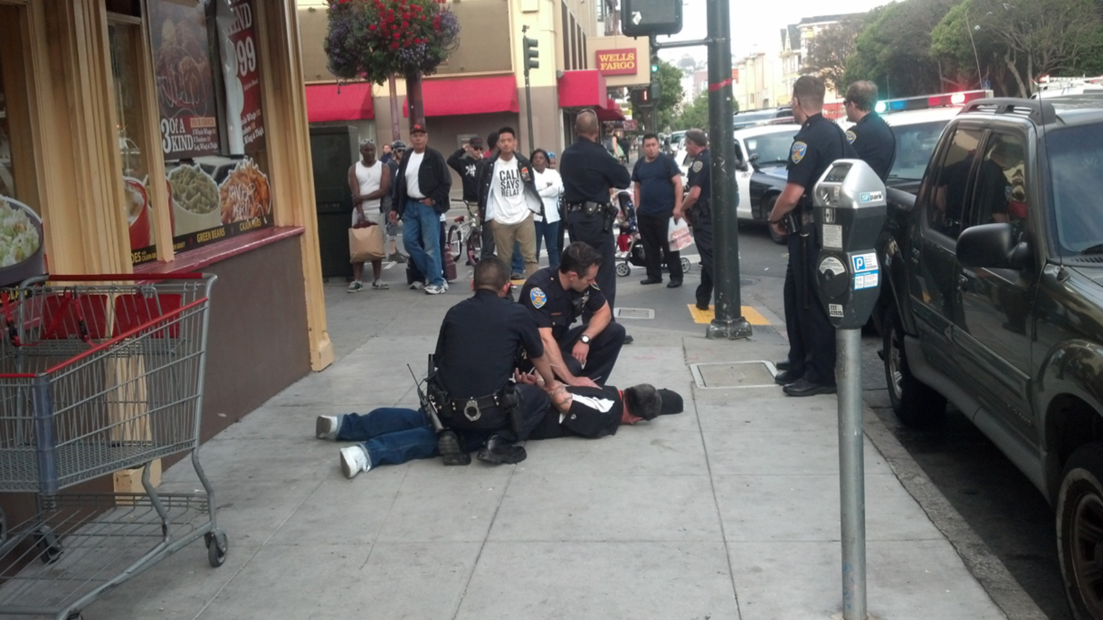The victim called his dispatcher on a radio, and the cops arrived within a minute and a half, he said. He fled to the other side of Mission Street, as cops restrained the man with plastic handcuffs in front of Popeyes.
