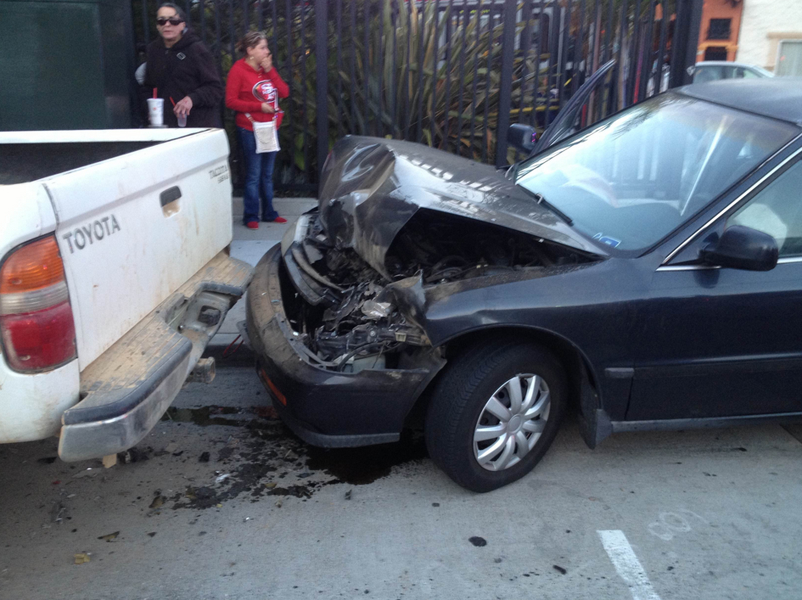 At approximately 8:20 Tuesday night, a dark green Honda collided with a parked white Toyota truck on the corner of Mission and Valencia streets following a car chase by California Highway Patrol.
