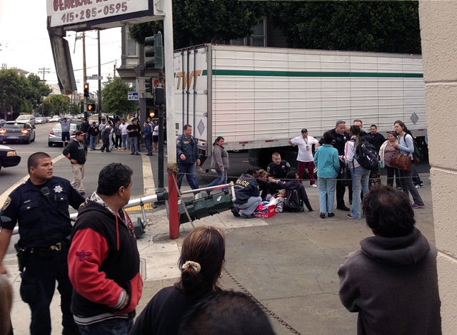 One of the women was walking and the other was conscious, but clearly in pain. The one that was not ambulatory was placed on a board and both were transported to a hospital, most likely San Francisco General.