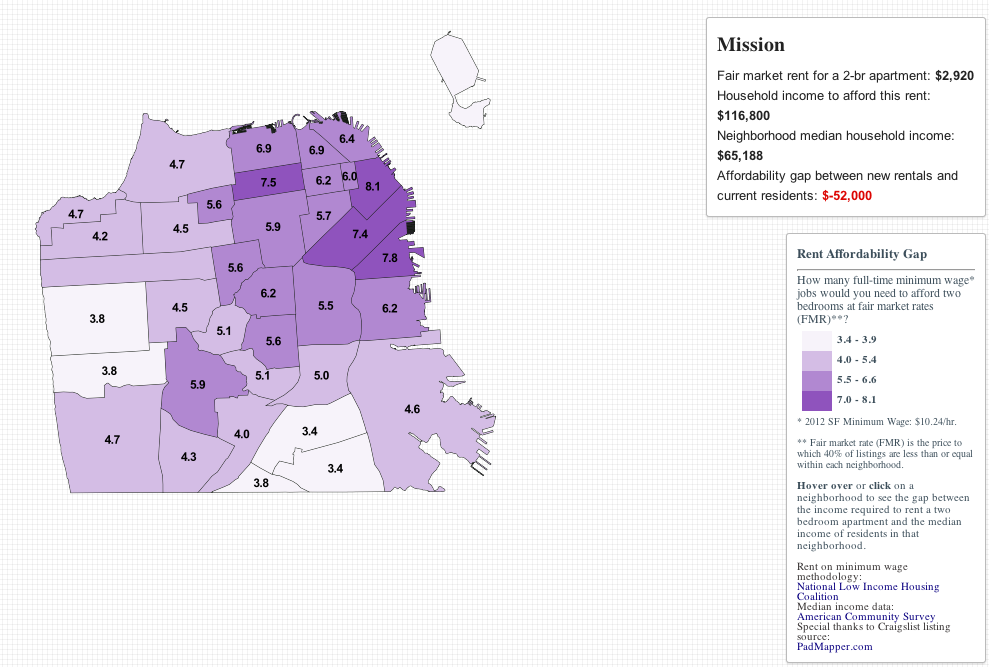 The San Francisco Department of Public Health has been rolling out some very nifty maps based on data the department collects. One of the more interesting maps illustrates how many minimum wage jobs it would take to afford to live in different city neighborhoods. Not surprisingly the Mission is not the cheapest place to live. See other maps here.