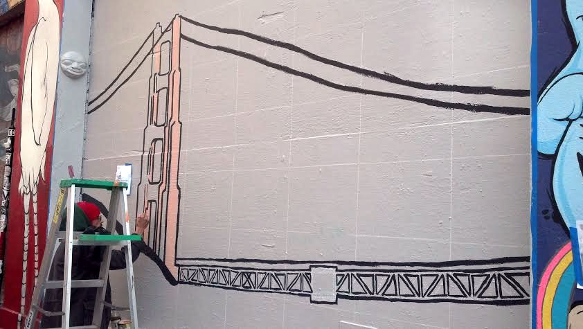 Statton, who has been a member of the Clarion Alley Mural Project for years, spent yesterday buffing The Tamale Lady wall and today painting a bridge on the new blank space. Taped next to where he was working was a list of “Shame” and “Solutions.” Included under “Shame” were things such as “‘Google Buses’/SFMTA,” “3,705 Ellis Evictions 1997-2013,” “Corporate Tax Giveaways by Mayor Ed Lee,” and “Airbnb.”