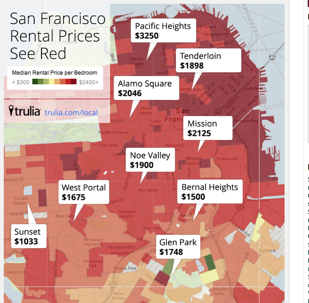 In case you haven’t heard, it’s hard out there for a tenant. San Francisco rent price increases are outpacing the nation– more than three-fold. In December, rental prices in San Francisco rose 10.6%, which is higher than the national average of 3.0%. Trulia’s Rental Price heatmap above captures the median price per bedroom (not entire apt) for some of the popular San Francisco neighborhoods. Deep reds indicate high-cost areas, and yellow and green designate more affordable neighborhoods….. If we can use the words “affordable” and “San Francisco apartment rentals” in the same sentence.
