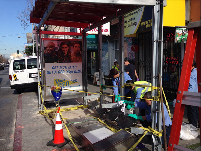 We Built This City caught city workers fixing the bus shelter hit Friday night by a driver who crossed lanes and also hit a 35-year-old pedestrian.