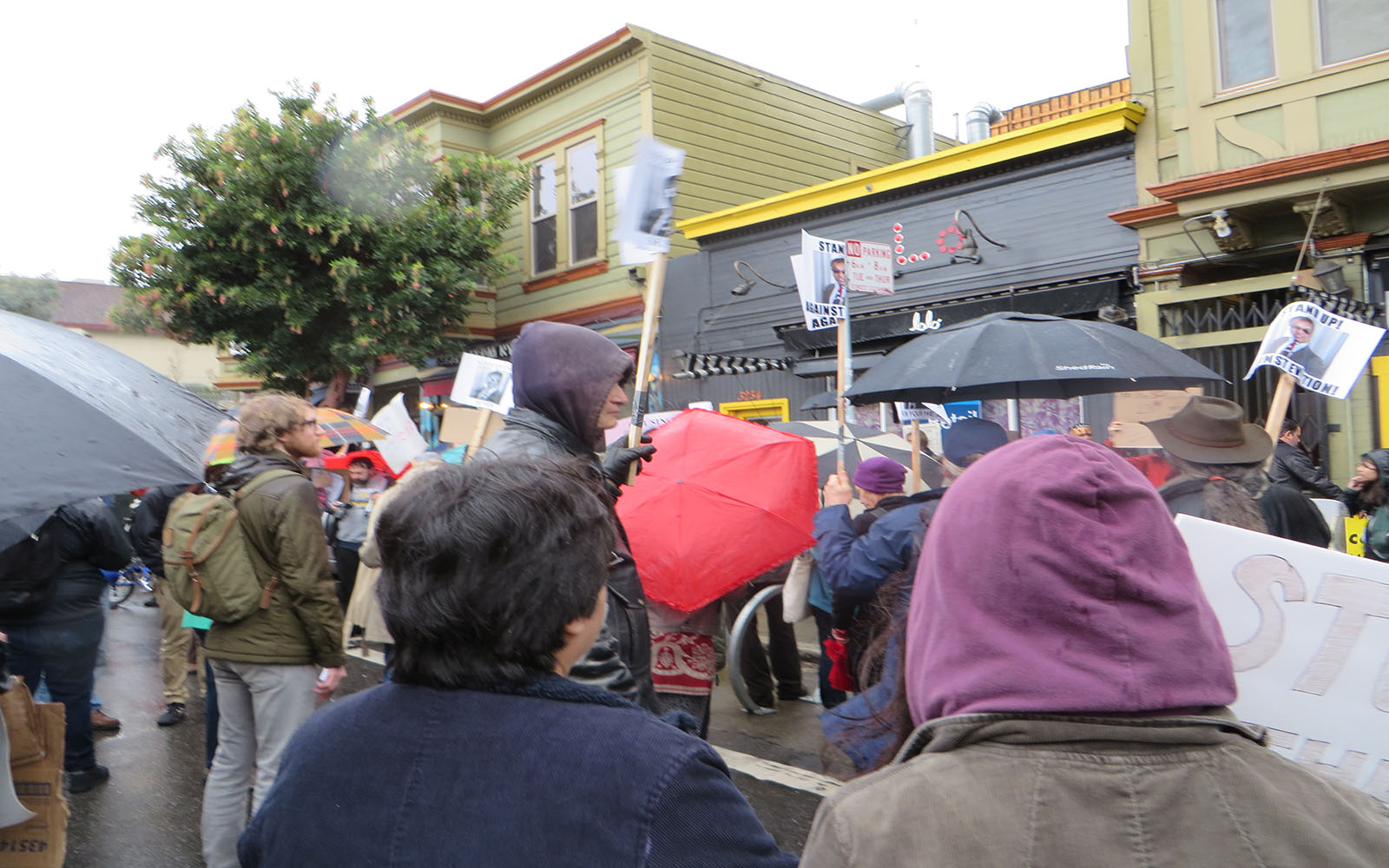 As rain fell, anti-eviction protesters marched to the offices of landlord Kaushik Dattani on 22nd Street at noon today. Mr. Dattani was not in the office at the time so the protesters phoned and sent text messages calling on him to stop the eviction of longtime Mission resident Patricia Kerman and her roommate Thomas Rapp.