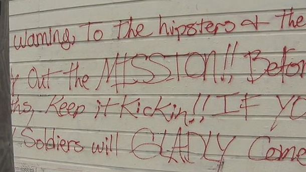 Graffiti appeared on the corner of 24th and Bryant Friday morning, but it was not your run of the mill neighborhood tags, it was something more threatening. Among other things, its author wrote to “Kill hipster yuppies,” and threatened violence if this group didn’t leave the neighborhood in six months.
