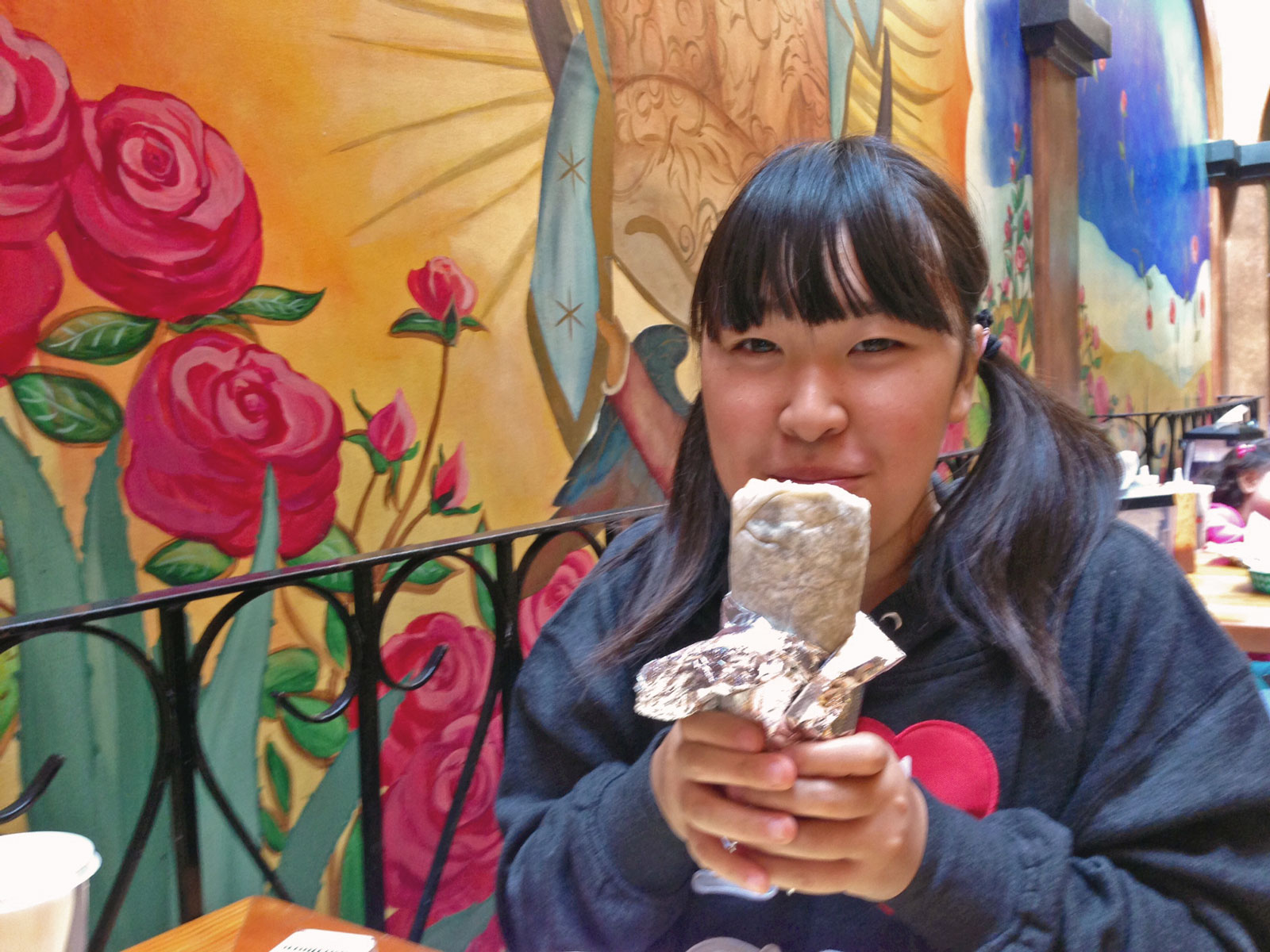Moeka's first Burrito experience at La Corneta. This is not a New York burrito.