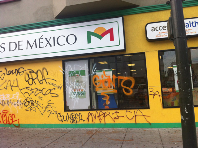 Further north on Mission Street, across from the now tagged and abandoned building where T-Mobile used to be, the pharmacy Milagros de Mexico had its storefront and six glass windows tagged. Maura Huerta, an employee of the pharmacy, said city workers have already stopped by to ask them to remove it. The city issues a minimum fine of $500 to business if graffiti is not removed within 30 days.