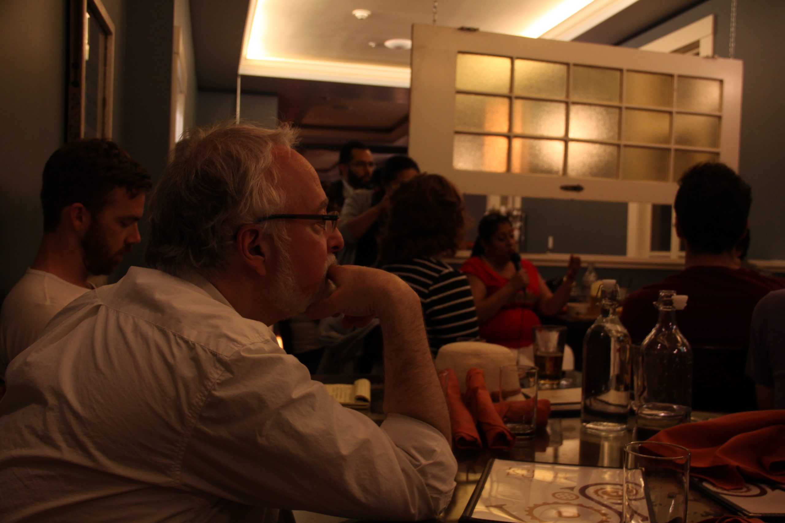 Urban Putt owner Steve Fox listens to other members of the Engage SF group, which met Monday evening. Photo by Laura Wenus.